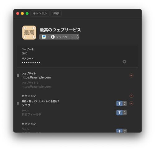 1Password にはカスタムフィールドという機能があります。これを使うと、ログインのためのちょっとしたメモや、秘密の質問の答えなど、好きな情報を id/pass とともに記録できます。 秘密の質問の答えを記録している様子 ところでこのカスタムフィールドは、…